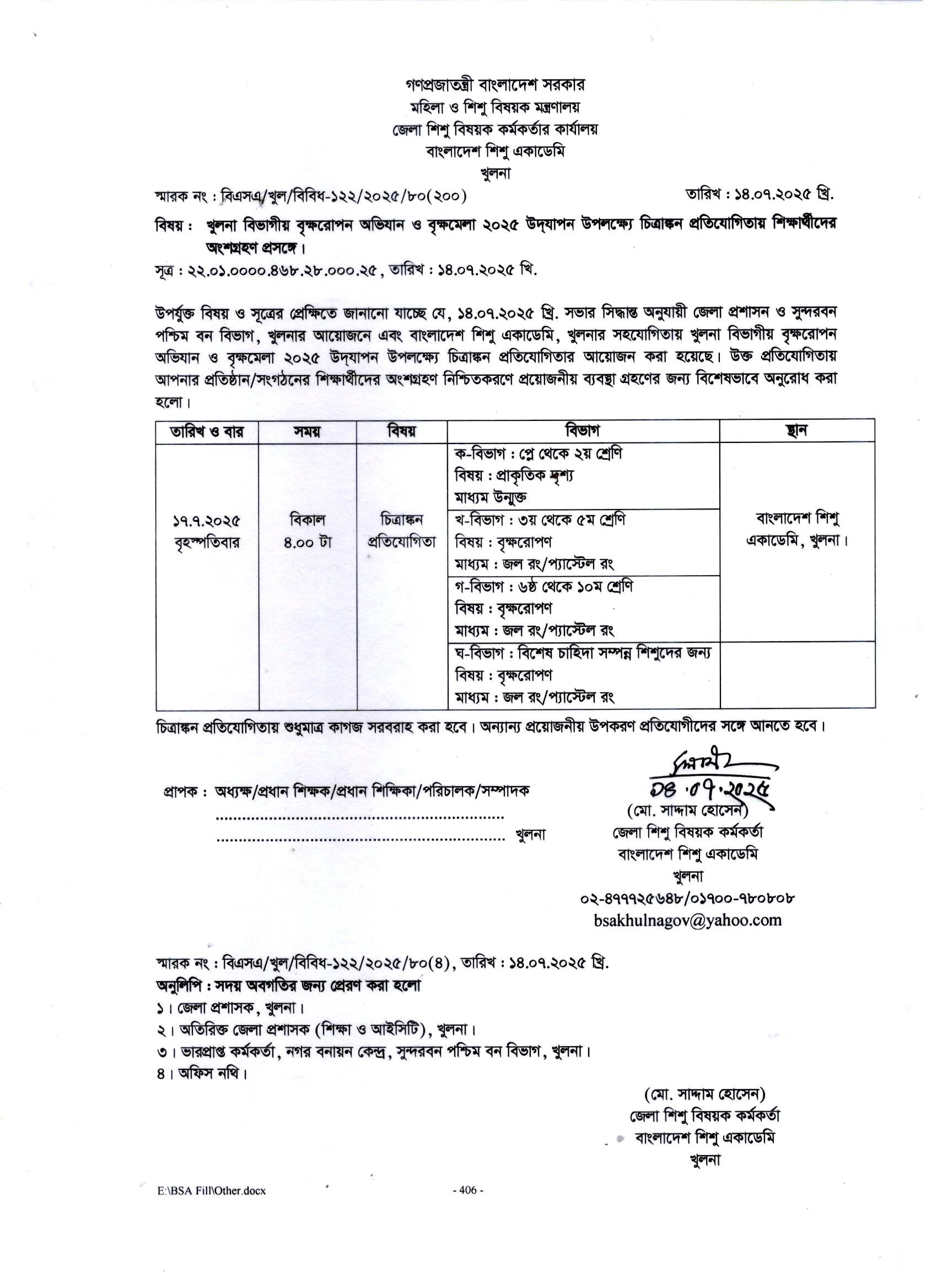 খুলনা বিভাগীয় বৃক্ষরোপন অভিযান ও বৃক্ষমেলা ২০২৫ উদযাপন উপলক্ষ্যে চিত্রাংকন প্রতিযোগিতায় শিক্ষার্থীদের অংশগ্রহণ প্রসঙ্গে