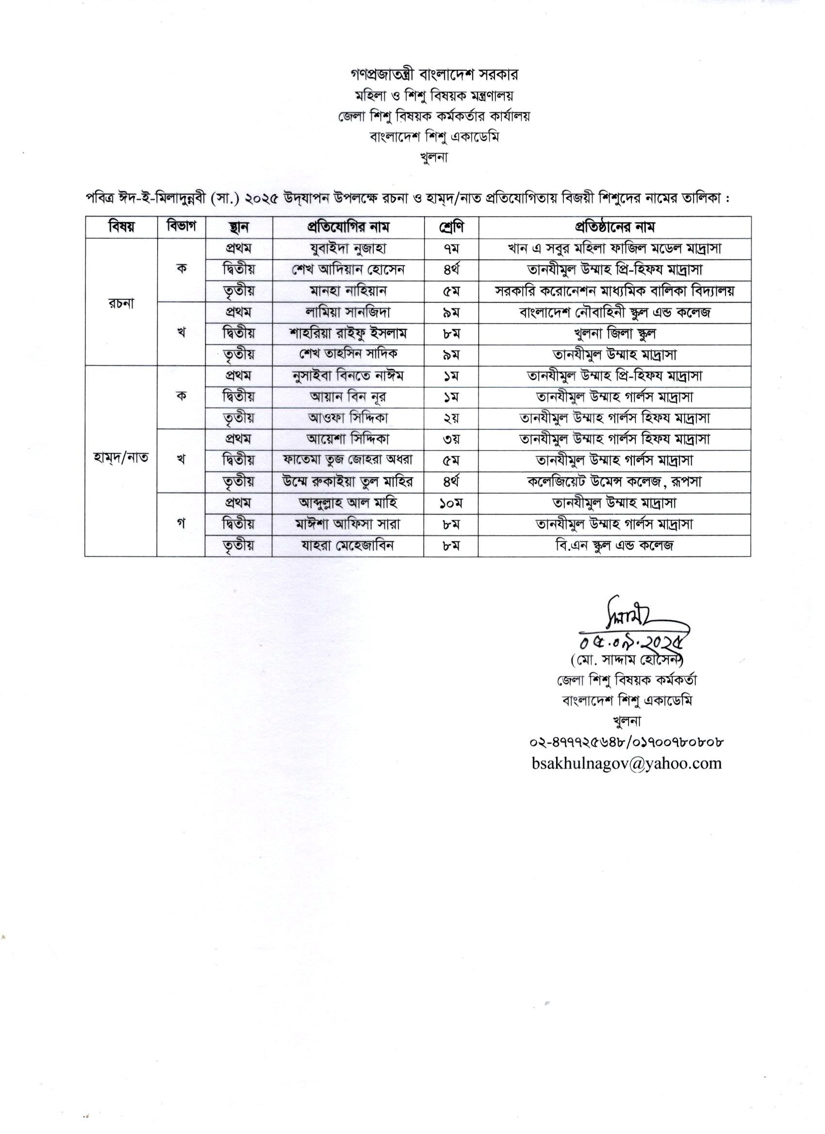 পবিত্র ঈদ-ই-মিলাদুন্নবী (সা:) ২০২৫ উপলক্ষে রচনা ও হামদ/নাত প্রতিযোগিতায় বিজয়ী শিশুদের নামের তালিকা :