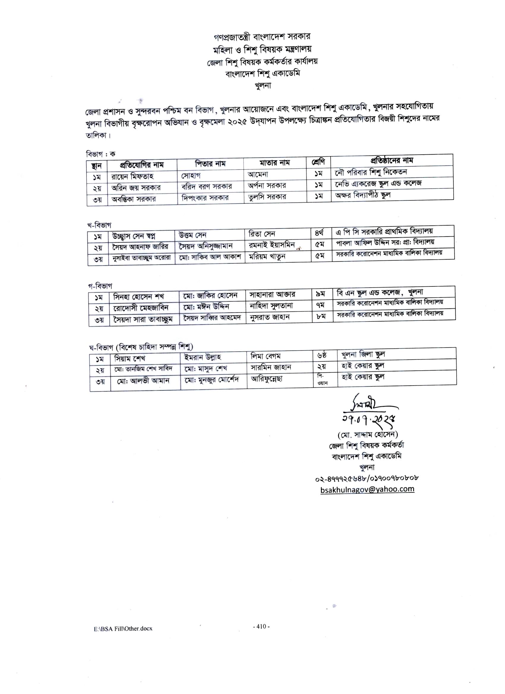| ৩ | মহান বিজয় দিবস ২০২৫ উপলক্ষ্যে বিভিন্ন প্রতিযোগিতায় বিজয়ী শিশুদের নামের তালিকা | | | ১৩-১২-২০২৫ | দেখুন |