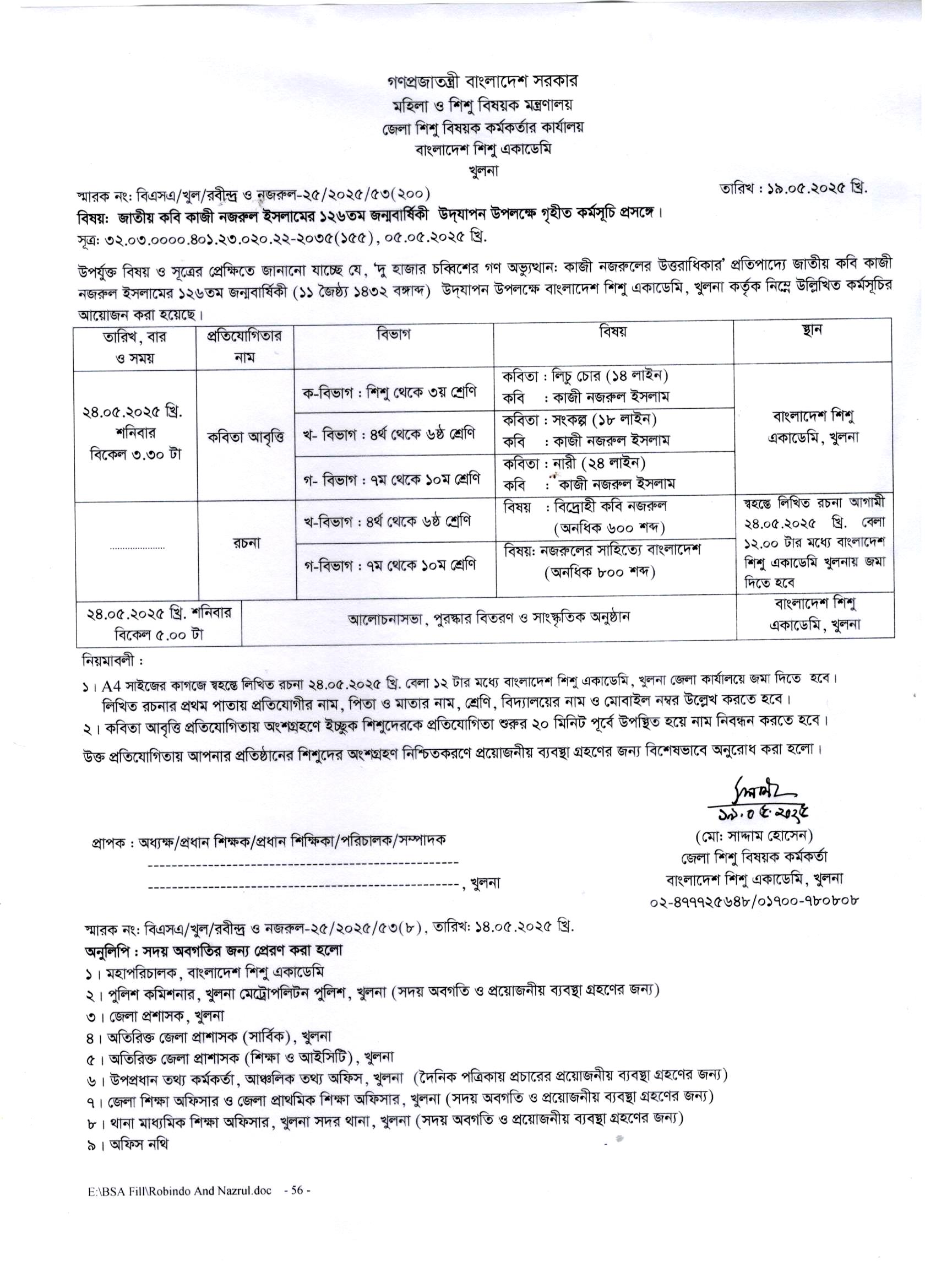 | ১০ | জাতীয় কবি কাজী নজরুল ইসলামের ১২৬তম জন্মবর্ষিকী উপলক্ষে গৃহীত কর্মসূচি প্রসঙ্গে। | | | ১৯-০৫-২০২৫ | দেখুন |