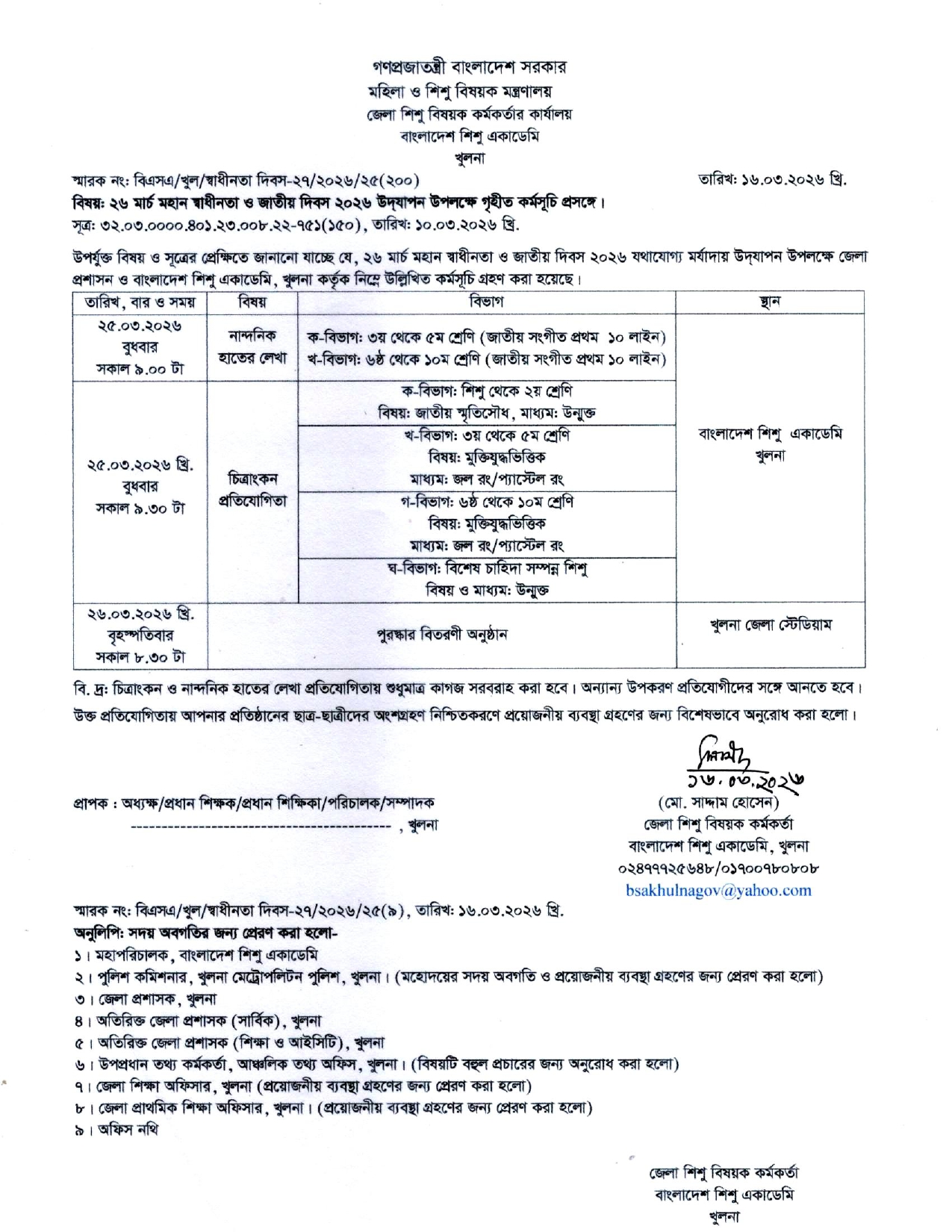 ২৬ মার্চ মহান স্বাধীনতা ও জাতীয় দিবস ২০২৬ উদযাপন উপলক্ষে গৃহীত কর্মসূচি